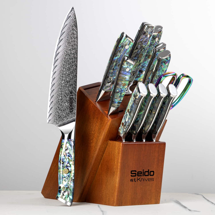 Perfect for organized kitchens, Seido’s block sets come with a sleek knife holder often made of acacia wood or acrylic that keeps your knives safe, clean, and beautifully displayed.