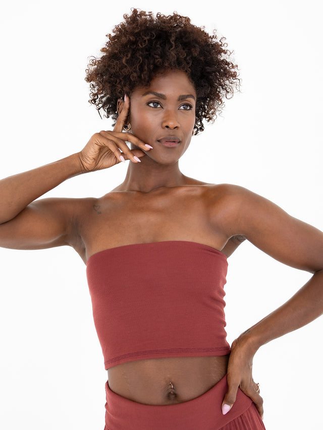 Its double-layered design provides gentle compression and extra support, allowing you to wear it confidently without underlayers, while the strapless tube silhouette keeps the look timeless and adaptable. The earthy Redwood shade adds warmth and depth, making it flattering across a wide range of skin tones and easy to style with both neutral and bold pieces.