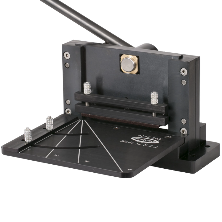 The 6-inch Designer Series Guillotine shear is the next level of shear, allowing the user to cover a greater area of the sheet without compromising precision. This is a tool designed for a jeweler who cuts larger blanks or makes bracelets, cuffs, and repeated strips. This model has a perpendicular handle, unlike many horizontal cutters. This provides you with a stable downward control, and you use less force each time you cut. The feeder table is 10 x 7 and doubles as a miter box, with angle markings laser-etched that allow one to align the metal perfectly. The 6.25" blades can pass through complete 6" sheets without any resistance. All blades undergo a heat-treatment program to improve their longevity and resistance to edge loss. The adjustable material stop provides reliable repeat cuts, which is helpful when you have runs of the same pieces to make. Although it can support heavier gauges than the 4" version, it does not occupy a large area on the bench.
